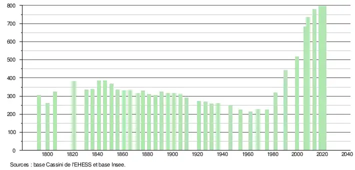 L'évolution du nombre d'habitants est connue à travers les recensements de la population effectués dans la commune depuis 1793. Pour les communes de moins de 10 000 habitants, une enquête de recensement portant sur toute la population est réalisée tous les cinq ans, les populations légales des années intermédiaires étant quant à elles estimées par interpolation ou extrapolation[16]. Pour la commune, le premier recensement exhaustif entrant dans le cadre du nouveau dispositif a été réalisé en 2008[17].