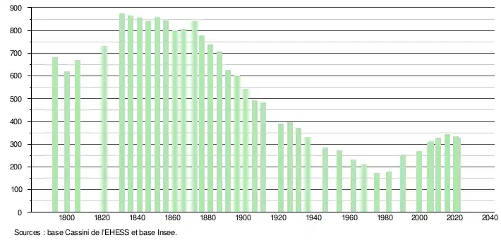 | L'évolution du nombre d'habitants est connue à travers les recensements de la population effectués dans la commune depuis 1793. Pour les communes de moins de 10 000 habitants, une enquête de recensement portant sur toute la population est réalisée tous les cinq ans, les populations légales des années intermédiaires étant quant à elles estimées par interpolation ou extrapolation[39]. Pour la commune, le premier recensement exhaustif entrant dans le cadre du nouveau dispositif a été réalisé en 2005[40]. En 2021, la commune comptait 327 habitants[Note 7], en diminution de 4,39 % par rapport à 2015 (Ariège : +1,38 %, France hors Mayotte : +1,84 %). |