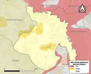 Le retrait-gonflement des sols argileux est susceptible d'engendrer des dommages importants aux bâtiments en cas d’alternance de périodes de sécheresse et de pluie. 11,2 % de la superficie communale est en aléa moyen ou fort (19,2 % au niveau départemental et 48,5 % au niveau national). Sur les 45 bâtiments dénombrés sur la commune en 2019, 1 sont en aléa moyen ou fort, soit 2 %, à comparer aux 17 % au niveau départemental et 54 % au niveau national. Une cartographie de l'exposition du territoire national au retrait gonflement des sols argileux est disponible sur le site du BRGM[21],[Carte 2].