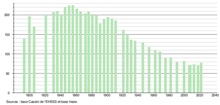 L'évolution du nombre d'habitants est connue à travers les recensements de la population effectués dans la commune depuis 1793. Pour les communes de moins de 10 000 habitants, une enquête de recensement portant sur toute la population est réalisée tous les cinq ans, les populations légales des années intermédiaires étant quant à elles estimées par interpolation ou extrapolation[24]. Pour la commune, le premier recensement exhaustif entrant dans le cadre du nouveau dispositif a été réalisé en 2007[25].