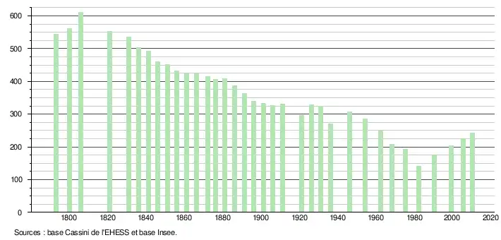 - Dans le tableau des recensements et le graphique, par convention dans Wikipédia, le principe a été retenu, pour les populations légales postérieures à 1999 de n’afficher dans le tableau des recensements et le graphique que les populations correspondant à l'année 2006, première population légale publiée calculée conformément aux concepts définis dans le décret no 2003-485 du 5 juin 2003, et les années correspondant à une enquête exhaustive de recensement pour les communes de moins de 10 000 habitants, ainsi que la dernière population légale publiée par l’Insee.