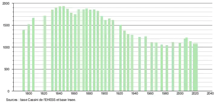 L'évolution du nombre d'habitants est connue à travers les recensements de la population effectués dans la commune depuis 1793. Pour les communes de moins de 10 000 habitants, une enquête de recensement portant sur toute la population est réalisée tous les cinq ans, les populations légales des années intermédiaires étant quant à elles estimées par interpolation ou extrapolation[40]. Pour la commune, le premier recensement exhaustif entrant dans le cadre du nouveau dispositif a été réalisé en 2008[41].