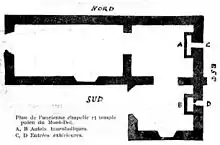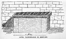 - Le temple possédait, à sa partie orientale, deux autels-passoires en pierre, dont la table, percée de trois rangs de neuf quadrilatères en entonnoir, reposait, par ses bords sur trois pièces de support, de manière que l'autel restât creux. Ces autels sont détruits en 1802 pour utiliser ses matériaux à la construction du télégraphe Chappe. Une maquette du plus grand des autels a été faite.