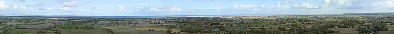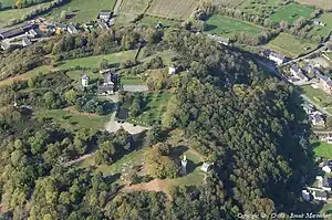 Vue aérienne du Mont Dol. On distingue deux moulins, un ancien bâtiment de ferme, la tour Notre-Dame-de-l'Espérance et la chapelle Saint-Michel