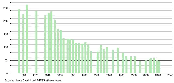 L'évolution du nombre d'habitants est connue à travers les recensements de la population effectués dans la commune depuis 1793. Pour les communes de moins de 10 000 habitants, une enquête de recensement portant sur toute la population est réalisée tous les cinq ans, les populations légales des années intermédiaires étant quant à elles estimées par interpolation ou extrapolation[18]. Pour la commune, le premier recensement exhaustif entrant dans le cadre du nouveau dispositif a été réalisé en 2008[19].