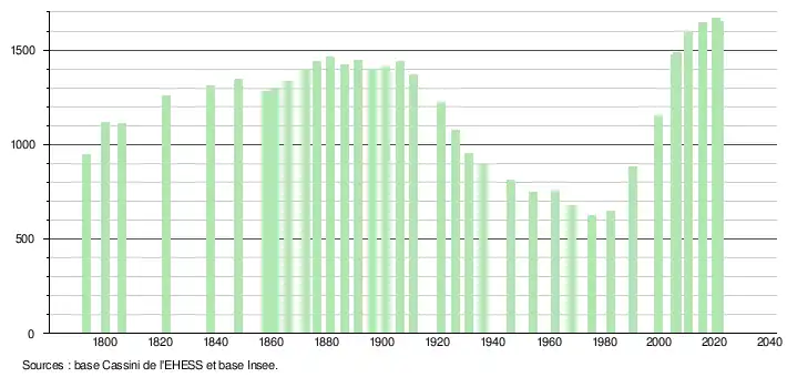 L'évolution du nombre d'habitants est connue à travers les recensements de la population effectués dans la commune depuis 1793. Pour les communes de moins de 10 000 habitants, une enquête de recensement portant sur toute la population est réalisée tous les cinq ans, les populations légales des années intermédiaires étant quant à elles estimées par interpolation ou extrapolation[21]. Pour la commune, le premier recensement exhaustif entrant dans le cadre du nouveau dispositif a été réalisé en 2005[22].