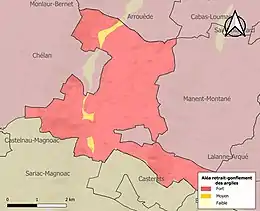 Le retrait-gonflement des sols argileux est susceptible d'engendrer des dommages importants aux bâtiments en cas d’alternance de périodes de sécheresse et de pluie. La totalité de la commune est en aléa moyen ou fort (94,5 % au niveau départemental et 48,5 % au niveau national). Sur les 58 bâtiments dénombrés sur la commune en 2019, 58 sont en aléa moyen ou fort, soit 100 %, à comparer aux 93 % au niveau départemental et 54 % au niveau national. Une cartographie de l'exposition du territoire national au retrait gonflement des sols argileux est disponible sur le site du BRGM[20],[Carte 3].