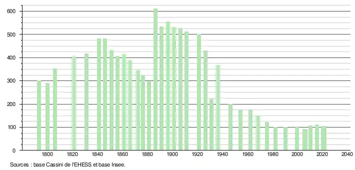| L'évolution du nombre d'habitants est connue à travers les recensements de la population effectués dans la commune depuis 1793. Pour les communes de moins de 10 000 habitants, une enquête de recensement portant sur toute la population est réalisée tous les cinq ans, les populations légales des années intermédiaires étant quant à elles estimées par interpolation ou extrapolation[21]. Pour la commune, le premier recensement exhaustif entrant dans le cadre du nouveau dispositif a été réalisé en 2005[22]. En 2021, la commune comptait 105 habitants[Note 3], en diminution de 5,41 % par rapport à 2015 (Gers : +0,79 %, France hors Mayotte : +1,84 %). |
