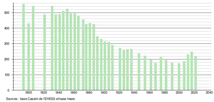 L'évolution du nombre d'habitants est connue à travers les recensements de la population effectués dans la commune depuis 1793. Pour les communes de moins de 10 000 habitants, une enquête de recensement portant sur toute la population est réalisée tous les cinq ans, les populations légales des années intermédiaires étant quant à elles estimées par interpolation ou extrapolation[16]. Pour la commune, le premier recensement exhaustif entrant dans le cadre du nouveau dispositif a été réalisé en 2006[17].