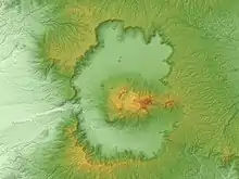 Vue aérienne du mont Aso au sein de sa caldeira. | ||||