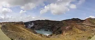 Le Naka-dake a un cratère d'environ 600 mètres de diamètre et 160 mètres de profondeur. Il contient un lac acide de couleur verte, qui se vidange parfois lors d'éruptions phréato-magmatiques. Ce cratère émet de nombreuses fumerolles.