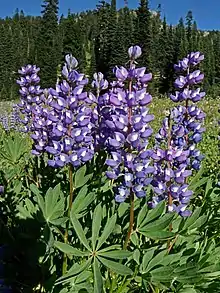 Au-dessus de 2 000 mètres d'altitude apparaît la végétation alpine composée d'herbes et d'arbustes comme la myrtille, la bistorte américaine, la luetkea et le lupin arctique[19] qui s'effacent petit à petit avec l'altitude au profit de l'étage nival caractérisé par des rochers, de la glace et de la neige et couvrant une bonne partie des flancs de la montagne.
