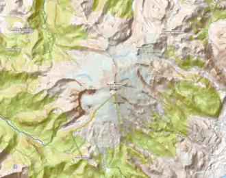 De ce sommet partent en étoile plusieurs crêtes formant des falaises comme Bastile Ridge au nord, Lava Divide au nord-est ou encore les Black Buttes, la plus grande, à l'ouest constituée notamment des pics Colfax, Lincoln et Seward[1]. Ces crêtes délimitent de larges vallées entièrement occupées par des glaciers jusqu'à une altitude de 2 000 mètres environ lorsqu'ils fondent en formant des ruisseaux qui rejoignent les vallées situées au pied de la montagne[1].