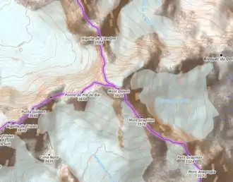Les arêtes WSW et NNW se rejoignent à 3 749 mètres d'altitude, au niveau d'un gendarme en contrebas et à 150 m au nord-ouest du point culminant[9]. Ce point constitue un nœud orographique important qui sépare les bassins de l'Arve en France, de la Doire Baltée en Italie et de la Drance en Suisse.