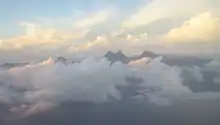 Vue aérienne annotée du mont Orohena, du Pito Hiti et du mont Aorai à l'aplomb de la vallée de Papenoo. | ||