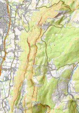 Ce côté ouest de la montagne du Revard présente une stratification des sous-sols très lisible sur une ligne de coupe naturelle géologique[11]. Une rupture de pente, difficilement observable à la base des pentes nord-occidentales du Revard en raison de leur boisement important, est due au chevauchement frontal du massif.
