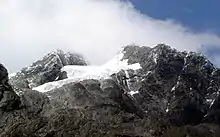 Vue du mont Stanley, avec le pic Alexandra à gauche et le pic Marguerite à droite, depuis le refuge John Matte à 3 414 mètres d'altitude. | |||