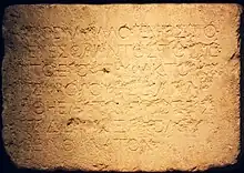 Pierre du Soreg à l'inscription (en grec) d'avertissement : « Ne laissez aucun étranger [à la Judée] entrer dans le parapet et la cloison qui entoure l'enceinte du Temple. Toute personne surprise [en violation] sera tenue responsable de sa mort [par la main divine] qui s'ensuivra » (Ier siècle av. J.-C.-Ier siècle)[7]. Temple d'Hérode (musée archéologique d'Istanbul).