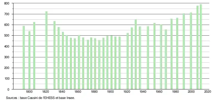 - Dans le tableau des recensements et le graphique, par convention dans Wikipédia, le principe a été retenu, pour les populations légales postérieures à 1999 de n’afficher dans le tableau des recensements et le graphique que les populations correspondant à l'année 2006, première population légale publiée calculée conformément aux concepts définis dans le décret no 2003-485 du 5 juin 2003, et les années correspondant à une enquête exhaustive de recensement pour les communes de moins de 10 000 habitants, ainsi que la dernière population légale publiée par l’Insee.