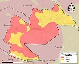 La commune est vulnérable au risque de mouvements de terrains constitué principalement du retrait-gonflement des sols argileux[16]. Cet aléa est susceptible d'engendrer des dommages importants aux bâtiments en cas d’alternance de périodes de sécheresse et de pluie. 99 % de la superficie communale est en aléa moyen ou fort (59,3 % au niveau départemental et 48,5 % au niveau national). Sur les 1 634 bâtiments dénombrés sur la commune en 2019, 1 634 sont en aléa moyen ou fort, soit 100 %, à comparer aux 85 % au niveau départemental et 54 % au niveau national. Une cartographie de l'exposition du territoire national au retrait gonflement des sols argileux est disponible sur le site du BRGM[17],[Carte 2].