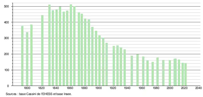 L'évolution du nombre d'habitants est connue à travers les recensements de la population effectués dans la commune depuis 1793. Pour les communes de moins de 10 000 habitants, une enquête de recensement portant sur toute la population est réalisée tous les cinq ans, les populations légales des années intermédiaires étant quant à elles estimées par interpolation ou extrapolation[27]. Pour la commune, le premier recensement exhaustif entrant dans le cadre du nouveau dispositif a été réalisé en 2007[28].
