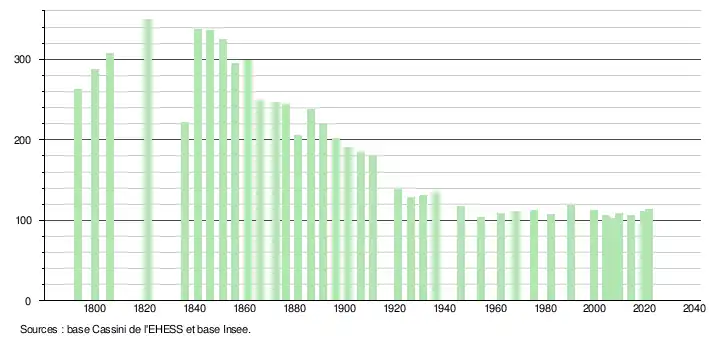L'évolution du nombre d'habitants est connue à travers les recensements de la population effectués dans la commune depuis 1793. Pour les communes de moins de 10 000 habitants, une enquête de recensement portant sur toute la population est réalisée tous les cinq ans, les populations légales des années intermédiaires étant quant à elles estimées par interpolation ou extrapolation[13]. Pour la commune, le premier recensement exhaustif entrant dans le cadre du nouveau dispositif a été réalisé en 2004[14].