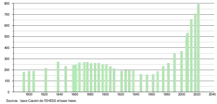 L'évolution du nombre d'habitants est connue à travers les recensements de la population effectués dans la commune depuis 1793. Pour les communes de moins de 10 000 habitants, une enquête de recensement portant sur toute la population est réalisée tous les cinq ans, les populations légales des années intermédiaires étant quant à elles estimées par interpolation ou extrapolation[11]. Pour la commune, le premier recensement exhaustif entrant dans le cadre du nouveau dispositif a été réalisé en 2007[12].