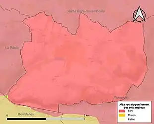 Le retrait-gonflement des sols argileux est susceptible d'engendrer des dommages importants aux bâtiments en cas d’alternance de périodes de sécheresse et de pluie. La totalité de la commune est en aléa moyen ou fort (67,4 % au niveau départemental et 48,5 % au niveau national). Sur les 84 bâtiments dénombrés sur la commune en 2019, 84 sont en aléa moyen ou fort, soit 100 %, à comparer aux 84 % au niveau départemental et 54 % au niveau national. Une cartographie de l'exposition du territoire national au retrait gonflement des sols argileux est disponible sur le site du BRGM[20],[Carte 2].
