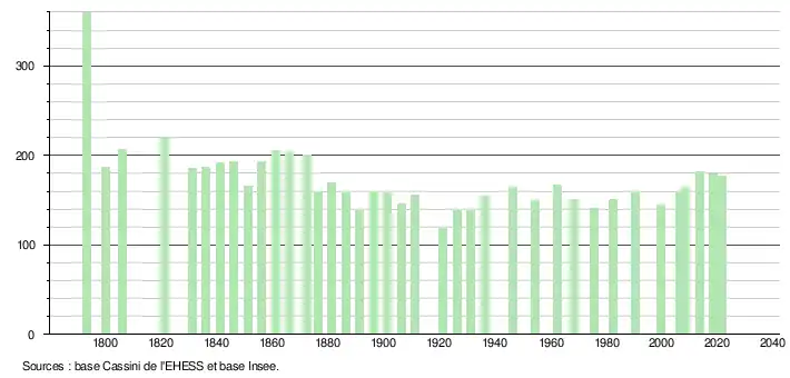 L'évolution du nombre d'habitants est connue à travers les recensements de la population effectués dans la commune depuis 1793. Pour les communes de moins de 10 000 habitants, une enquête de recensement portant sur toute la population est réalisée tous les cinq ans, les populations légales des années intermédiaires étant quant à elles estimées par interpolation ou extrapolation[26]. Pour la commune, le premier recensement exhaustif entrant dans le cadre du nouveau dispositif a été réalisé en 2008[27].