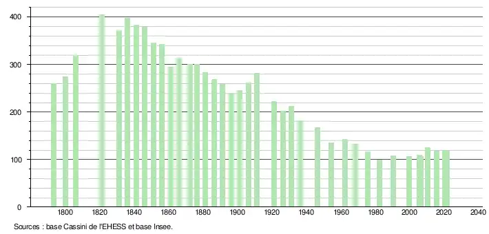 L'évolution du nombre d'habitants est connue à travers les recensements de la population effectués dans la commune depuis 1793. Pour les communes de moins de 10 000 habitants, une enquête de recensement portant sur toute la population est réalisée tous les cinq ans, les populations légales des années intermédiaires étant quant à elles estimées par interpolation ou extrapolation[37]. Pour la commune, le premier recensement exhaustif entrant dans le cadre du nouveau dispositif a été réalisé en 2005[38].