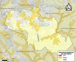 Le retrait-gonflement des sols argileux est susceptible d'engendrer des dommages importants aux bâtiments en cas d’alternance de périodes de sécheresse et de pluie. 79 % de la superficie communale est en aléa moyen ou fort (26,8 % au niveau départemental et 48,5 % au niveau national). Sur les 598 bâtiments dénombrés sur la commune en 2019, 164 sont en aléa moyen ou fort, soit 27 %, à comparer aux 36 % au niveau départemental et 54 % au niveau national. Une cartographie de l'exposition du territoire national au retrait gonflement des sols argileux est disponible sur le site du BRGM[5],[6].