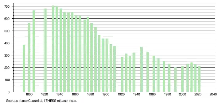 L'évolution du nombre d'habitants est connue à travers les recensements de la population effectués dans la commune depuis 1793. Pour les communes de moins de 10 000 habitants, une enquête de recensement portant sur toute la population est réalisée tous les cinq ans, les populations légales des années intermédiaires étant quant à elles estimées par interpolation ou extrapolation[24]. Pour la commune, le premier recensement exhaustif entrant dans le cadre du nouveau dispositif a été réalisé en 2006[25].