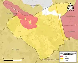 Les mouvements de terrains susceptibles de se produire sur la commune sont des tassements différentiels[16]. Le retrait-gonflement des sols argileux est susceptible d'engendrer des dommages importants aux bâtiments en cas d’alternance de périodes de sécheresse et de pluie[17]. 95,5 % de la superficie communale est en aléa moyen ou fort (54,9 % au niveau départemental et 48,5 % au niveau national)[Carte 2]. Depuis le , en application de la loi ELAN, différentes contraintes s'imposent aux vendeurs, maîtres d'ouvrages ou constructeurs de biens situés dans une zone classée en aléa moyen ou fort[Note 2],[18].