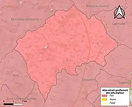 Le retrait-gonflement des sols argileux est susceptible d'engendrer des dommages importants aux bâtiments en cas d’alternance de périodes de sécheresse et de pluie. 99,8 % de la superficie communale est en aléa moyen ou fort (92 % au niveau départemental et 48,5 % au niveau national). Sur les 312 bâtiments dénombrés sur la commune en 2019, 304 sont en aléa moyen ou fort, soit 97 %, à comparer aux 96 % au niveau départemental et 54 % au niveau national. Une cartographie de l'exposition du territoire national au retrait gonflement des sols argileux est disponible sur le site du BRGM[26],[Carte 3].