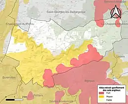 Les mouvements de terrains susceptibles de se produire sur la commune sont des affaissements et effondrements liés aux cavités souterraines (hors mines) et des tassements différentiels[23]. Afin de mieux appréhender le risque d’affaissement de terrain, un inventaire national permet de localiser les éventuelles cavités souterraines sur la commune[24]. Le retrait-gonflement des sols argileux est susceptible d'engendrer des dommages importants aux bâtiments en cas d’alternance de périodes de sécheresse et de pluie[25]. 51,5 % de la superficie communale est en aléa moyen ou fort (79,5 % au niveau départemental et 48,5 % au niveau national)[Carte 2]. Depuis le , en application de la loi ÉLAN, différentes contraintes s'imposent aux vendeurs, maîtres d'ouvrages ou constructeurs de biens situés dans une zone classée en aléa moyen ou fort[Note 4],[26].