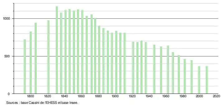 L'évolution du nombre d'habitants est connue à travers les recensements de la population effectués dans la commune depuis 1793. À partir du , les populations légales des communes sont publiées annuellement dans le cadre d'un recensement qui repose désormais sur une collecte d'information annuelle, concernant successivement tous les territoires communaux au cours d'une période de cinq ans. Pour les communes de moins de 10 000 habitants, une enquête de recensement portant sur toute la population est réalisée tous les cinq ans, les populations légales des années intermédiaires étant quant à elles estimées par interpolation ou extrapolation[20]. Pour la commune, le premier recensement exhaustif entrant dans le cadre du nouveau dispositif a été réalisé en 2008[21],[Note 2].