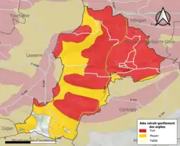 Les mouvements de terrains susceptibles de se produire sur la commune sont soit des chutes de blocs, soit des glissements de terrains, soit des effondrements liés à des cavités souterraines, soit des mouvements liés au retrait-gonflement des argiles. Près de 50 % de la superficie du département est concernée par l'aléa retrait-gonflement des argiles, dont la commune de Montardit[38]. L'inventaire national des cavités souterraines permet par ailleurs de localiser celles situées sur la commune[39].