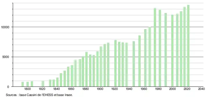 - Par convention dans Wikipédia, le principe a été retenu de n’afficher dans le tableau des recensements et le graphique, pour les populations légales postérieures à 1999, que les populations correspondant à une enquête exhaustive de recensement pour les communes de moins de 10 000 habitants, et que les populations des années 2006, 2011, 2016, etc. pour les communes de plus de 10 000 habitants, ainsi que la dernière population légale publiée par l’Insee pour l'ensemble des communes.