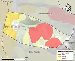 La commune est vulnérable au risque de mouvements de terrains constitué principalement du retrait-gonflement des sols argileux[35]. Cet aléa est susceptible d'engendrer des dommages importants aux bâtiments en cas d’alternance de périodes de sécheresse et de pluie. 48 % de la superficie communale est en aléa moyen ou fort (88,8 % au niveau départemental et 48,5 % au niveau national). Sur les 243 bâtiments dénombrés sur la commune en 2019, 113 sont en aléa moyen ou fort, soit 47 %, à comparer aux 98 % au niveau départemental et 54 % au niveau national. Une cartographie de l'exposition du territoire national au retrait gonflement des sols argileux est disponible sur le site du BRGM[36],[Carte 3].