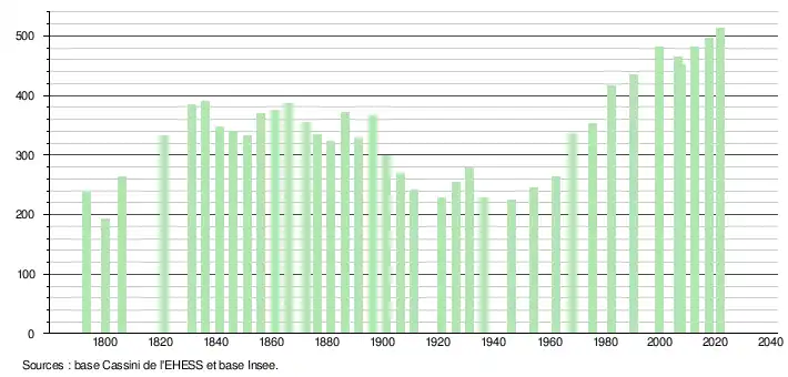L'évolution du nombre d'habitants est connue à travers les recensements de la population effectués dans la commune depuis 1793. Pour les communes de moins de 10 000 habitants, une enquête de recensement portant sur toute la population est réalisée tous les cinq ans, les populations légales des années intermédiaires étant quant à elles estimées par interpolation ou extrapolation[44]. Pour la commune, le premier recensement exhaustif entrant dans le cadre du nouveau dispositif a été réalisé en 2007[45].