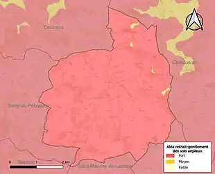 Le retrait-gonflement des sols argileux est susceptible d'engendrer des dommages importants aux bâtiments en cas d’alternance de périodes de sécheresse et de pluie[20]. La totalité de la commune est en aléa moyen ou fort (91,8 % au niveau départemental et 48,5 % au niveau national)[Carte 2]. Depuis le , en application de la loi ELAN, différentes contraintes s'imposent aux vendeurs, maîtres d'ouvrages ou constructeurs de biens situés dans une zone classée en aléa moyen ou fort[Note 3],[21].