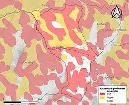 La commune est vulnérable au risque de mouvements de terrains constitué principalement du retrait-gonflement des sols argileux[21]. Cet aléa est susceptible d'engendrer des dommages importants aux bâtiments en cas d’alternance de périodes de sécheresse et de pluie. 84,3 % de la superficie communale est en aléa moyen ou fort (76,3 % au niveau départemental et 48,5 % au niveau national). Sur les 34 bâtiments dénombrés sur la commune en 2019, 28 sont en aléa moyen ou fort, soit 82 %, à comparer aux 90 % au niveau départemental et 54 % au niveau national. Une cartographie de l'exposition du territoire national au retrait gonflement des sols argileux est disponible sur le site du BRGM[22],[Carte 3].