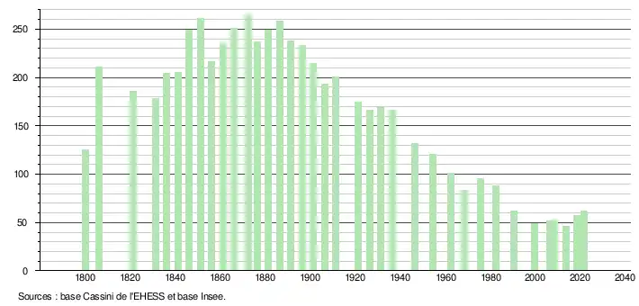 | L'évolution du nombre d'habitants est connue à travers les recensements de la population effectués dans la commune depuis 1800. Pour les communes de moins de 10 000 habitants, une enquête de recensement portant sur toute la population est réalisée tous les cinq ans, les populations légales des années intermédiaires étant quant à elles estimées par interpolation ou extrapolation[26]. Pour la commune, le premier recensement exhaustif entrant dans le cadre du nouveau dispositif a été réalisé en 2008[27]. En 2021, la commune comptait 62 habitants[Note 5], en augmentation de 47,62 % par rapport à 2015 (Tarn : +1,82 %, France hors Mayotte : +1,84 %). |