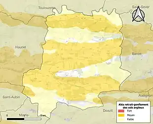 Le retrait-gonflement des sols argileux est susceptible d'engendrer des dommages importants aux bâtiments en cas d’alternance de périodes de sécheresse et de pluie. 60,7 % de la superficie communale est en aléa moyen ou fort (19,2 % au niveau départemental et 48,5 % au niveau national). Sur les 313 bâtiments dénombrés sur la commune en 2019, 125 sont en aléa moyen ou fort, soit 40 %, à comparer aux 17 % au niveau départemental et 54 % au niveau national. Une cartographie de l'exposition du territoire national au retrait gonflement des sols argileux est disponible sur le site du BRGM[33],[Carte 2].