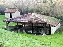 Brocas est le centre du pouvoir de la famille de Brocas au XIIIe siècle[45],[Note 3],[Note 4]. C'est le chef-lieu de la paroisse « depuis un temps immémorial », jusqu'à ce que le petit hameau de Montaut ne se développe en bourg fortifié au gré des rivalités seigneuriales et des conflits de la féodalité. Ce développement date essentiellement des guerres de Religion du XVIe siècle car Montaut a de meilleures défenses naturelles[46], perché à 120 m d'altitude avec des pentes d'accès nettement plus escarpées qu'à Brocas qui est de surcroît à seulement 90 m d'altitude[3]. L'église Saint-Pierre de Brocas, la plus ancienne et longtemps seule église de la paroisse[47], date du XIIIe siècle[48]. Une fontaine miraculeuse lui est associée, la fontaine de Saint-Pierre[47], à 1,9 km à l'est de Brocas[3] ; au XIXe siècle celle-ci est encore recouverte d'une construction en pierre en forme de reliquaire surmonté d'une croix, avec en façade une niche abritant une statue en terre cuite de saint Pierre[47].