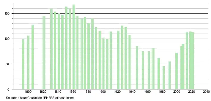 L'évolution du nombre d'habitants est connue à travers les recensements de la population effectués dans la commune depuis 1793. Pour les communes de moins de 10 000 habitants, une enquête de recensement portant sur toute la population est réalisée tous les cinq ans, les populations légales des années intermédiaires étant quant à elles estimées par interpolation ou extrapolation[17]. Pour la commune, le premier recensement exhaustif entrant dans le cadre du nouveau dispositif a été réalisé en 2008[18].