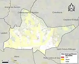 Le retrait-gonflement des sols argileux est susceptible d'engendrer des dommages importants aux bâtiments en cas d’alternance de périodes de sécheresse et de pluie. Aucune partie du territoire de la commune n'est en aléa moyen ou fort (15,8 % au niveau départemental et 48,5 % au niveau national). Sur les 149 bâtiments dénombrés sur la commune en 2019, aucun n'est en aléa moyen ou fort, à comparer aux 14 % au niveau départemental et 54 % au niveau national. Une cartographie de l'exposition du territoire national au retrait gonflement des sols argileux est disponible sur le site du BRGM[18],[Carte 2].