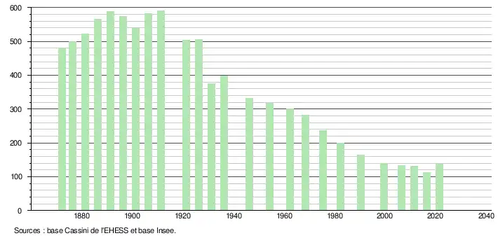 L'évolution du nombre d'habitants est connue à travers les recensements de la population effectués dans la commune depuis 1872. Pour les communes de moins de 10 000 habitants, une enquête de recensement portant sur toute la population est réalisée tous les cinq ans, les populations légales des années intermédiaires étant quant à elles estimées par interpolation ou extrapolation[22]. Pour la commune, le premier recensement exhaustif entrant dans le cadre du nouveau dispositif a été réalisé en 2006[23].