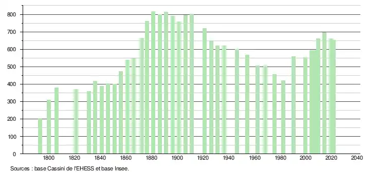 L'évolution du nombre d'habitants est connue à travers les recensements de la population effectués dans la commune depuis 1793. Pour les communes de moins de 10 000 habitants, une enquête de recensement portant sur toute la population est réalisée tous les cinq ans, les populations légales des années intermédiaires étant quant à elles estimées par interpolation ou extrapolation[24]. Pour la commune, le premier recensement exhaustif entrant dans le cadre du nouveau dispositif a été réalisé en 2004[25].