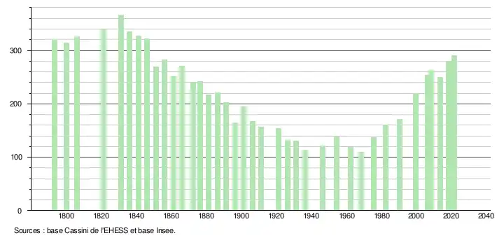 L'évolution du nombre d'habitants est connue à travers les recensements de la population effectués dans la commune depuis 1793. Pour les communes de moins de 10 000 habitants, une enquête de recensement portant sur toute la population est réalisée tous les cinq ans, les populations légales des années intermédiaires étant quant à elles estimées par interpolation ou extrapolation[19]. Pour la commune, le premier recensement exhaustif entrant dans le cadre du nouveau dispositif a été réalisé en 2008[20].